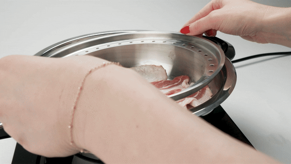 Set your adapter ring in your large skillet, then cover with your 3 qt. lid to prevent splatter around your kitchen when frying bacon, chicken, pork, or other dishes. Frying just got a whole lot easier and cleaner.